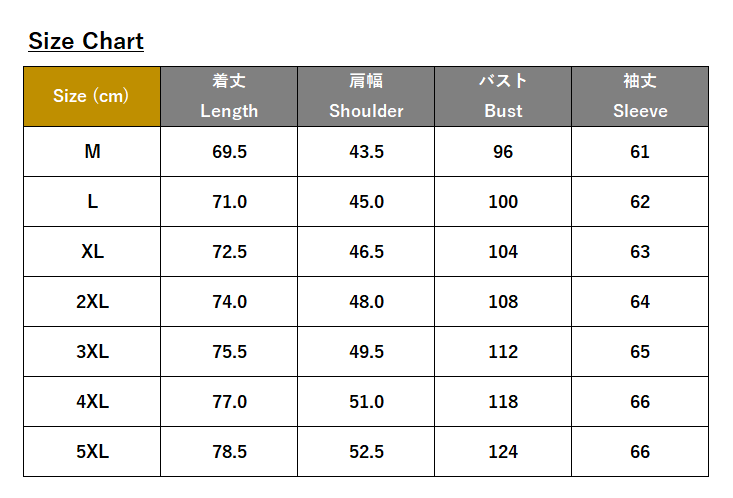 ・サイズ:M、L、XL、2XL、3XL、4XL、5XL