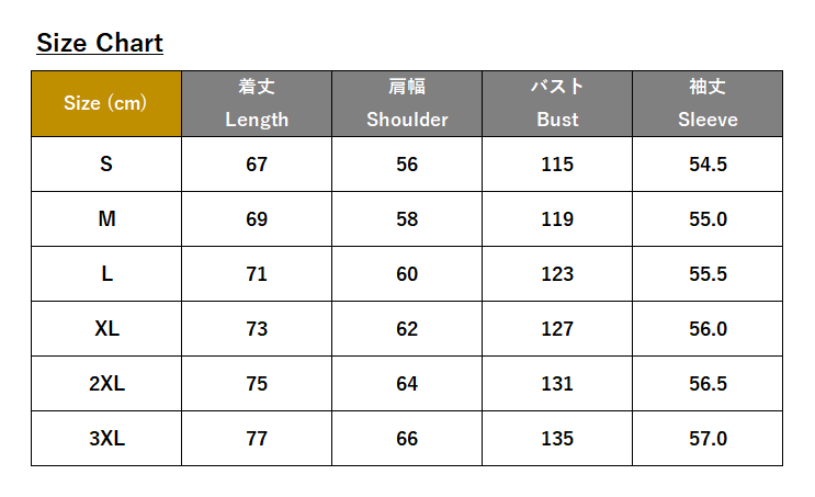 ・サイズ:S、M、L、XL、2XL、3XL