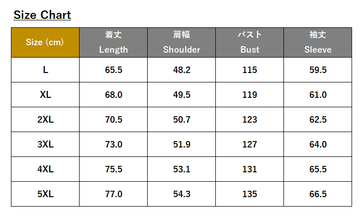・サイズ:L、XL、2XL、3XL、4XL、5XL