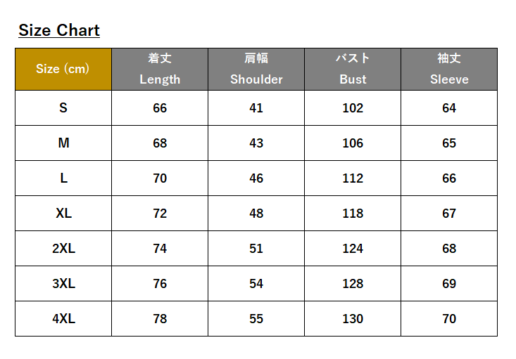 ・サイズ:S、M、L、XL、2XL、3XL、4XL