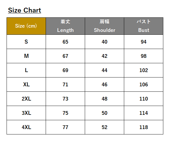 ・サイズ:S、M、L、XL、2XL、3XL、4XL