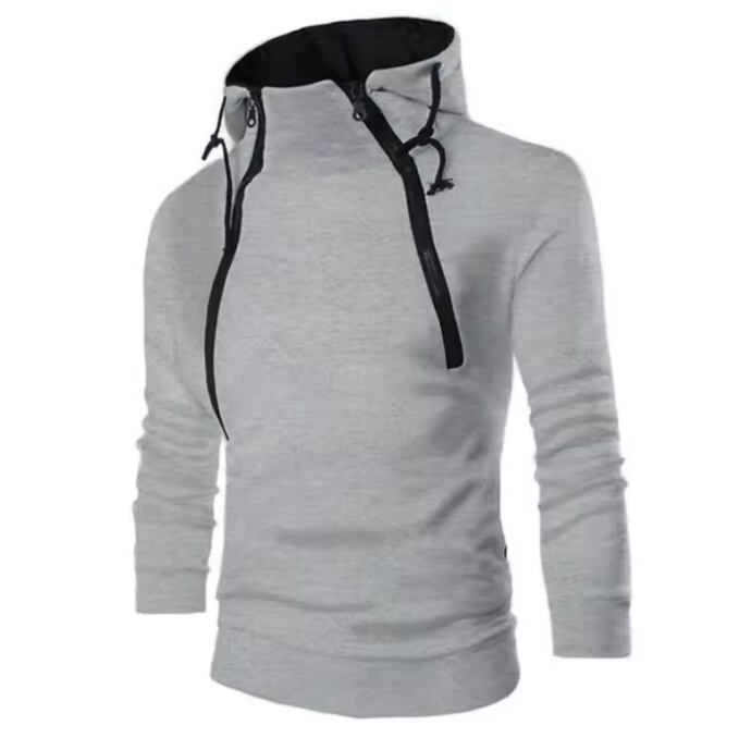 このフード付きダブルジッパー・プルオーバーは、左右のジッパーの長さが微妙に違うユニークなデザインです。スウェット素材のパーカーでカジュアルなシーンからアクティブな日常まで幅広く活躍します。