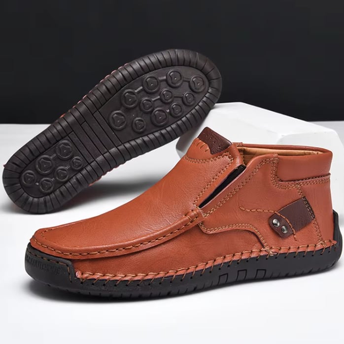 このセミハイカット・レザーシューズは、本革使用でハンドメイド仕上げが特徴です。ローカットの動きやすさとハイカットの安定感を兼ね備えたシューズで、カジュアルにもビジネスシーンにも幅広く活躍する一足です。