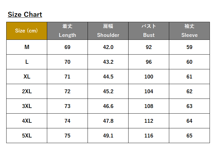 ・サイズ:M、L、XL、2XL、3XL、4XL、5XL
