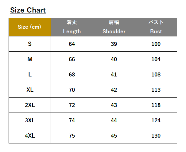 ・サイズ:S、M、L、XL、2XL、3XL、4XL